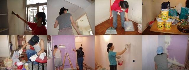 我們的新居 xx人生交叉點xx 一開始,陳先生和何小姐有好幾個方案: i)住在陳先生家,和陳爸爸&陳媽媽同住 ii)租住何媽媽家附近 iii)租住工作附近的小單位 iv)買一個小單位 經過一番討論和"內心的掙扎",最後選擇了方案(iii) =>租住工作附近的小單位。當決定了後,陳先生和何小姐用了差不多兩個月時間去找房子,最後他們選了一個距離工作地點"終極"近的兩房小單位。 一切都由零開始 0000 租來的房子什麼也沒有,牆壁也有點陳舊。收鎖匙的第二天已開始動工來一個大翻新了! 大大翻新包括: 牆身&天花"批當","吻灰",掃油漆 木板地大清洗和打水晶蠟